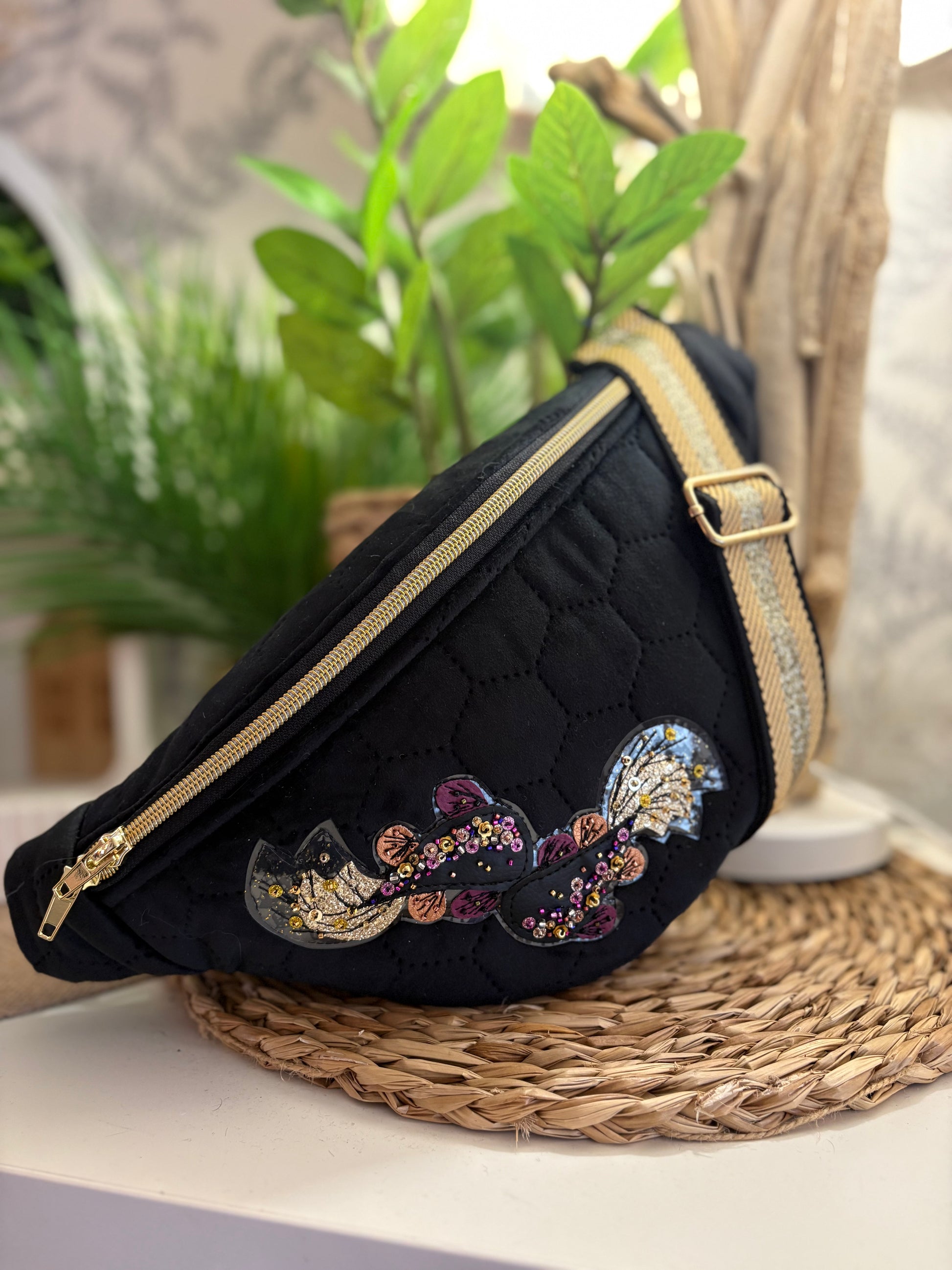 Banane velours noir combattants perlés à la main. Trois poches intérieur.